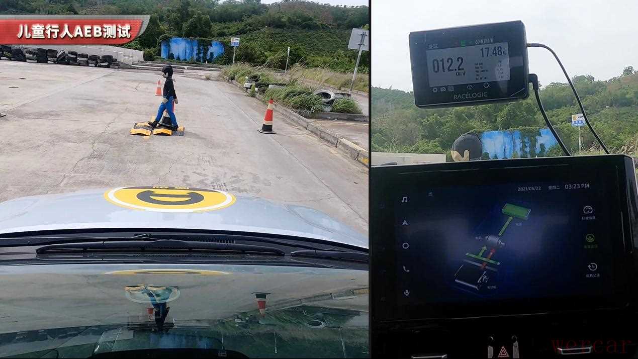 麋鹿测试之后是一段连续的减速带,在到达减速带区域的那一刻,驾驶员会刹车减速到30公里每小时左右,而减速带的尽头便是儿童行人AEB项目,驾驶员会让车辆自行刹停。