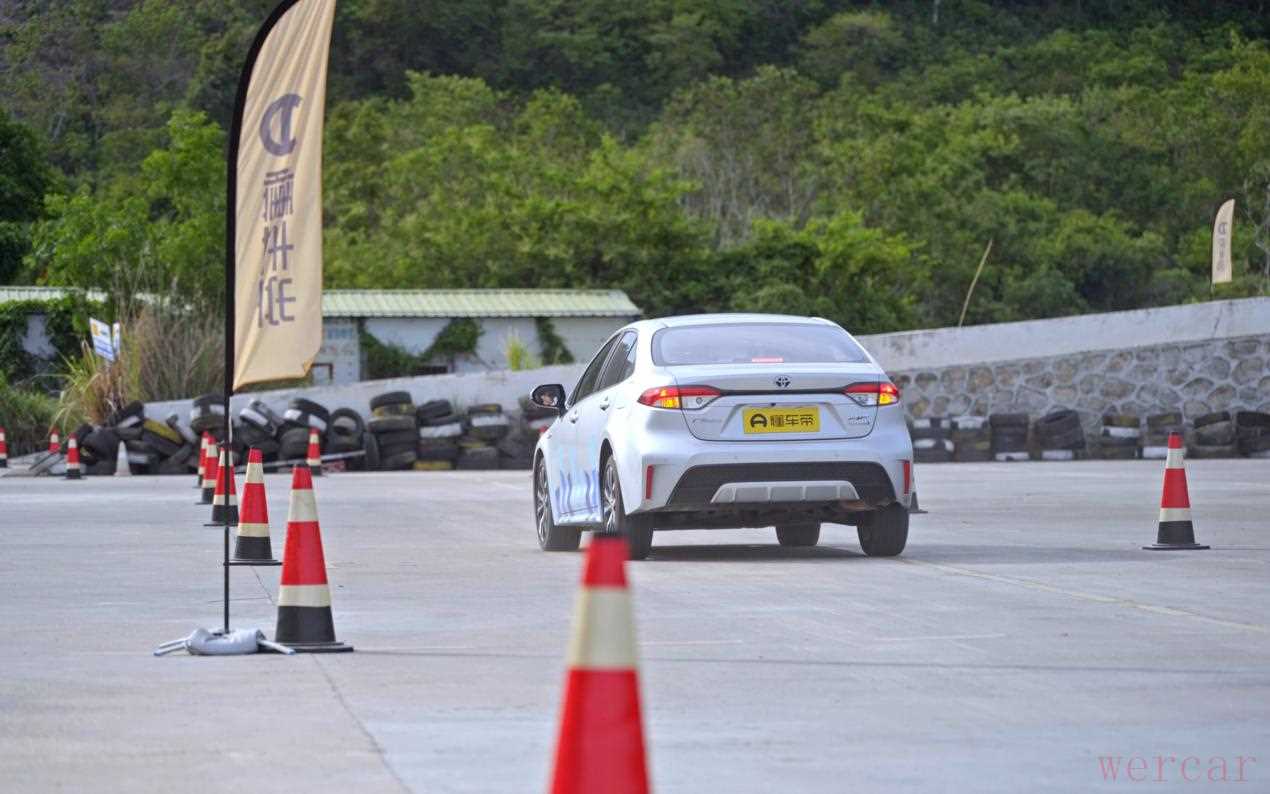根据十分科学的猜拳出场方式,美懿获得了第一个驾驶雷凌双擎的机会。在这条测试赛道内,车辆会全程开启运动模式。首先是全油门加速至60公里每小时,到达后驾驶员将一脚刹车踩死直至车辆停止,之后便是麋鹿测试。雷凌双擎在懂车帝的实测数据中麋鹿测试成绩为77.2公里每小时,但在此条赛道内为了保持测试的持续性,避免频繁捡桩桶,驾驶员不会每一次都将车辆的入桩速度推至极限。