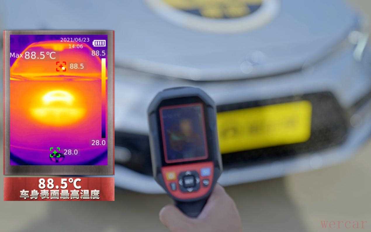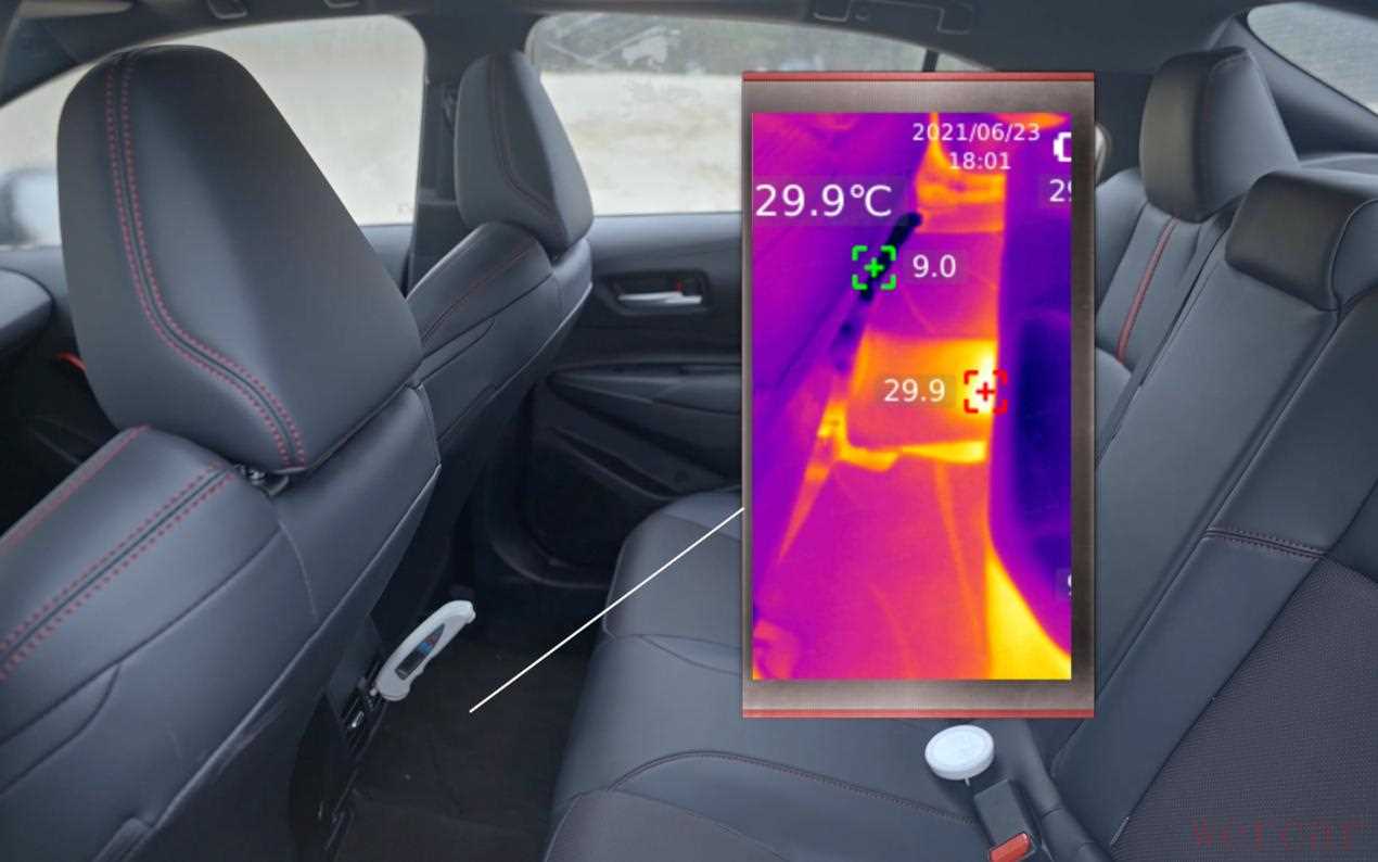 而动力电池长时间放电产生的热量也没有影响到雷凌双擎的车内。雷凌双擎的动力电池位于第二排座椅的下方,在测试结束车辆熄火之前我们使用红外热成像仪发现该处的表面温度并没有发现过热的情况,由此来看,雷凌双擎的这套混动系统在各个方面的成熟度都是可以令人满意的。