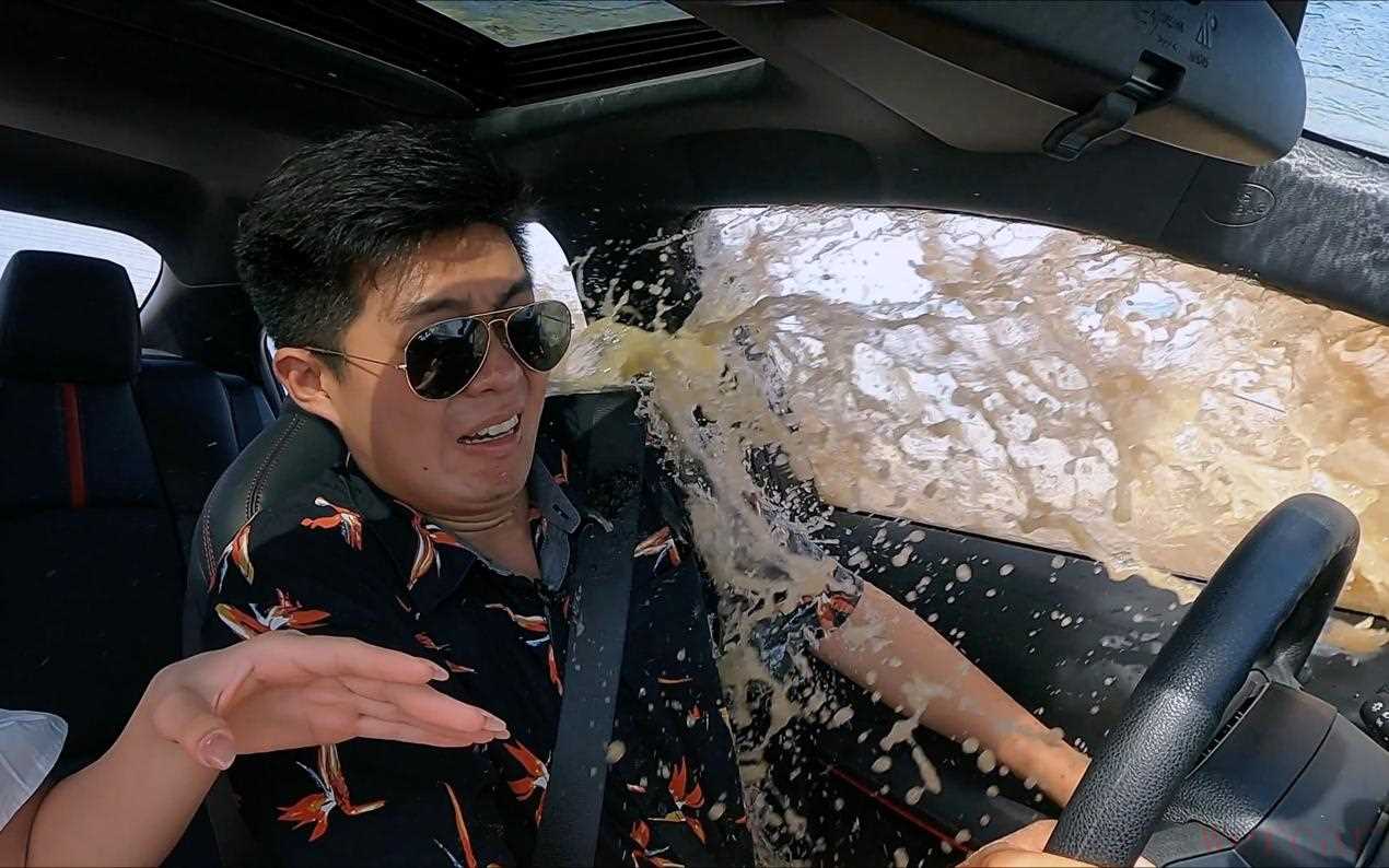 从当天测试的状况来看,开混动车偶尔的冲一次浪是不会有太大问题的,只不过要小心溅起的水花卷入车内,弄脏你的衣服和车辆的内饰,而在一旁吃瓜的观众例如若然,也要小心被暴躁的车主撂倒。