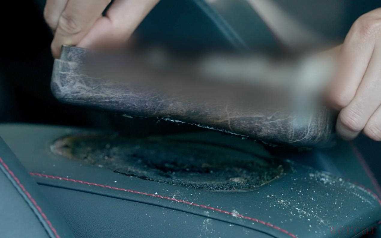 但尽管如此,车内的气味还是令人无法忍受,要想继续正常驾驶和运营,去洗车店做一个深度的除味是必不可少的。而且我们发现,放置一百根烟的中央扶手表面已经融化了,但是却没有燃烧起来,可以看出其材料的阻燃能力还是可以的,有一定防火效果。