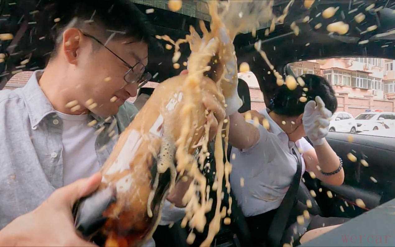 在9天的运营结束之际,若然与志明决定最后给美懿再放个“大招”,模拟在网约车场景下遇到乘客不小心遗撒了大量的液体,车内是否会出现短路以及是否好清洗。在本着实践出真知的理念下,若然和志明来到了雷凌双擎的车内,在美懿面前将大量的薄荷糖放入了汽水瓶内,瞬间汽水喷涌而出,雷凌双擎的前挡风、座椅、中控屏、仪表台无一幸免。