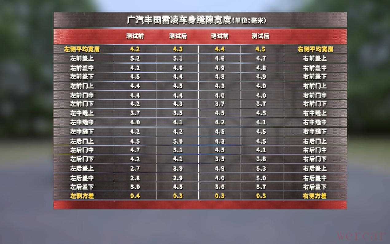 我们在测试前后,还测量了这台雷凌双擎的车身缝隙,在新车状态下左侧缝隙平均宽度为4.2毫米,右侧为4.4毫米,方差分别为0.4和0.3。经过了1万公里的强化测试,左右两侧缝隙平均宽度轻微变大至4.3和4.5毫米,方差却同为0.3。有可能这一万公里长时间的颠簸振得比较匀,虽然缝隙稍有变宽,但是缝隙的均匀程度变化不大。