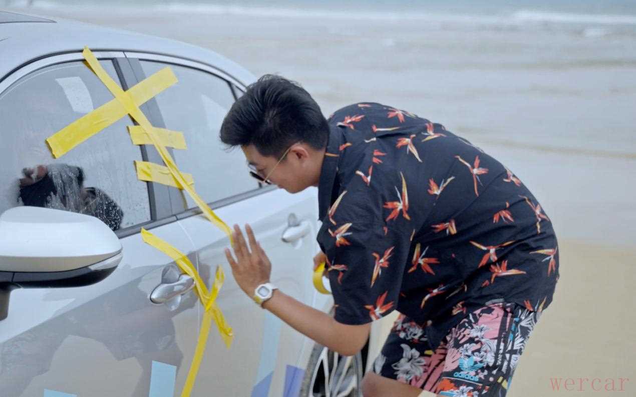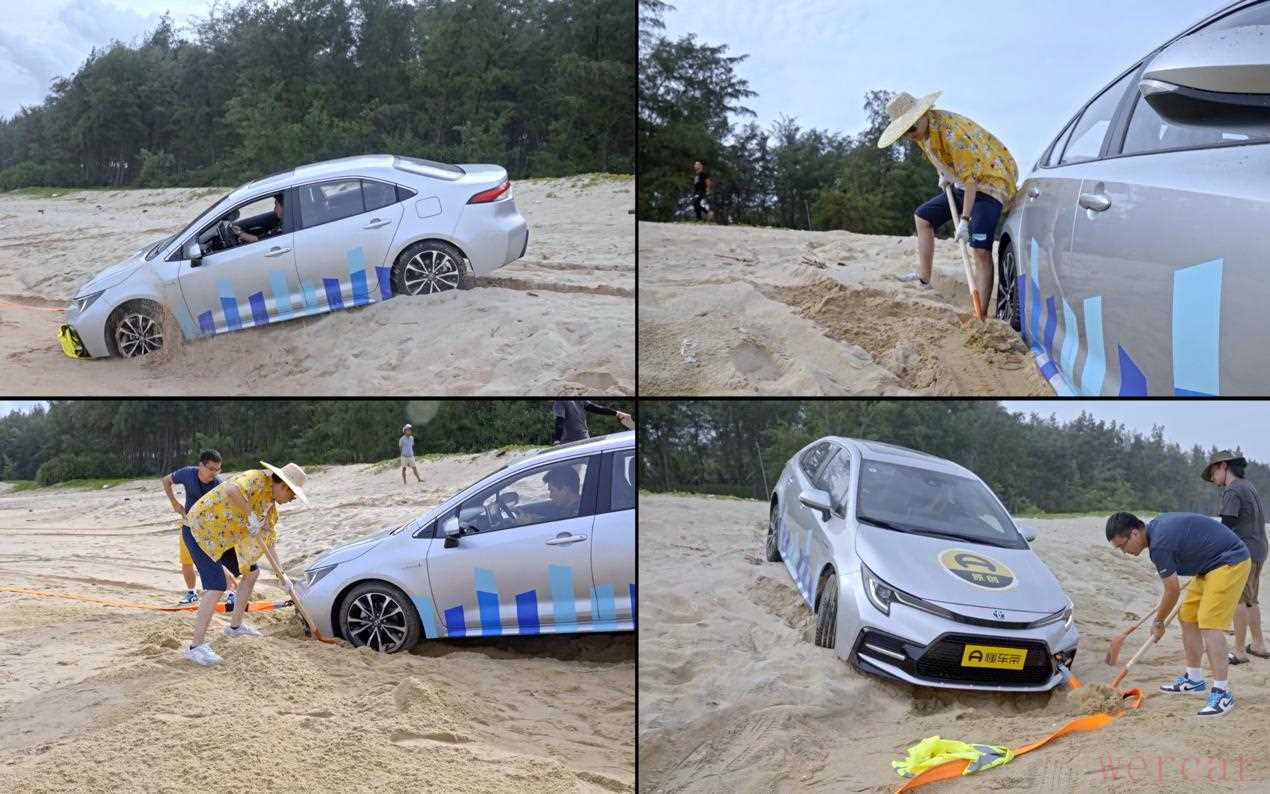 然而理想总是很美好,现实却很骨感。志明开着雷凌刚踏入沙滩半步便惨遭陷车,毕竟雷凌不是越野车,没有较高的离地间隙也没有四驱,趴窝在沙滩上是难免的,挖了半天之后还是若然开着越野保障车拖着雷凌双擎完成了带美懿乘车冲浪的项目。