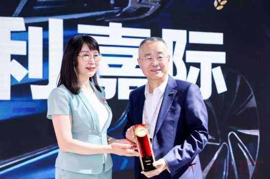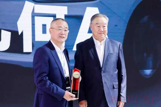 中国机械工业联合会会长王瑞祥(左)为吉利控股集团汽车销售公司副总经理陈洪生(右)颁奖