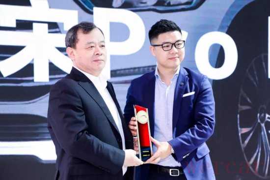 中国国际贸易促进委员会汽车行业分会会长王侠(左)为比亚迪汽车销售有限公司总经理赵长江(右)颁奖
