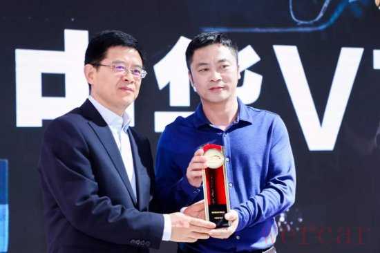 中国对外贸易中心副主任、中国对外贸易中心(集团)副总裁徐兵(左)为华晨中华华南区销售总监王福洋(右)颁奖