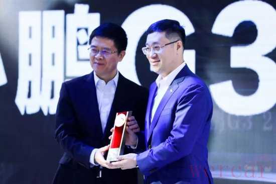 中国对外贸易中心副主任、中国对外贸易中心(集团)副总裁徐兵(左)为小鹏汽车副总裁、品牌公关总经理李鹏程(右)颁奖