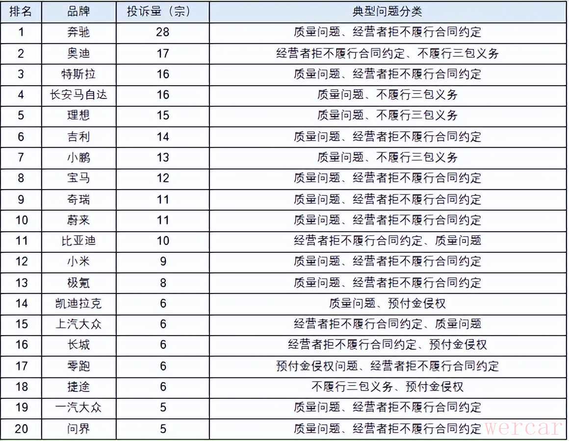 根据南京消协的统计数据,8月份投诉量中,奔驰28宗,奥迪17宗,特斯拉16宗,长安马自达16宗,理想15宗,吉利14宗,小鹏13宗,宝马12宗,奇瑞11宗,蔚来11宗,比亚迪10宗,小米9宗,极氪8宗,凯迪拉克6宗,上汽大众6宗,长城6宗,捷途6宗,零跑6宗,一汽大众5宗,问界5宗。