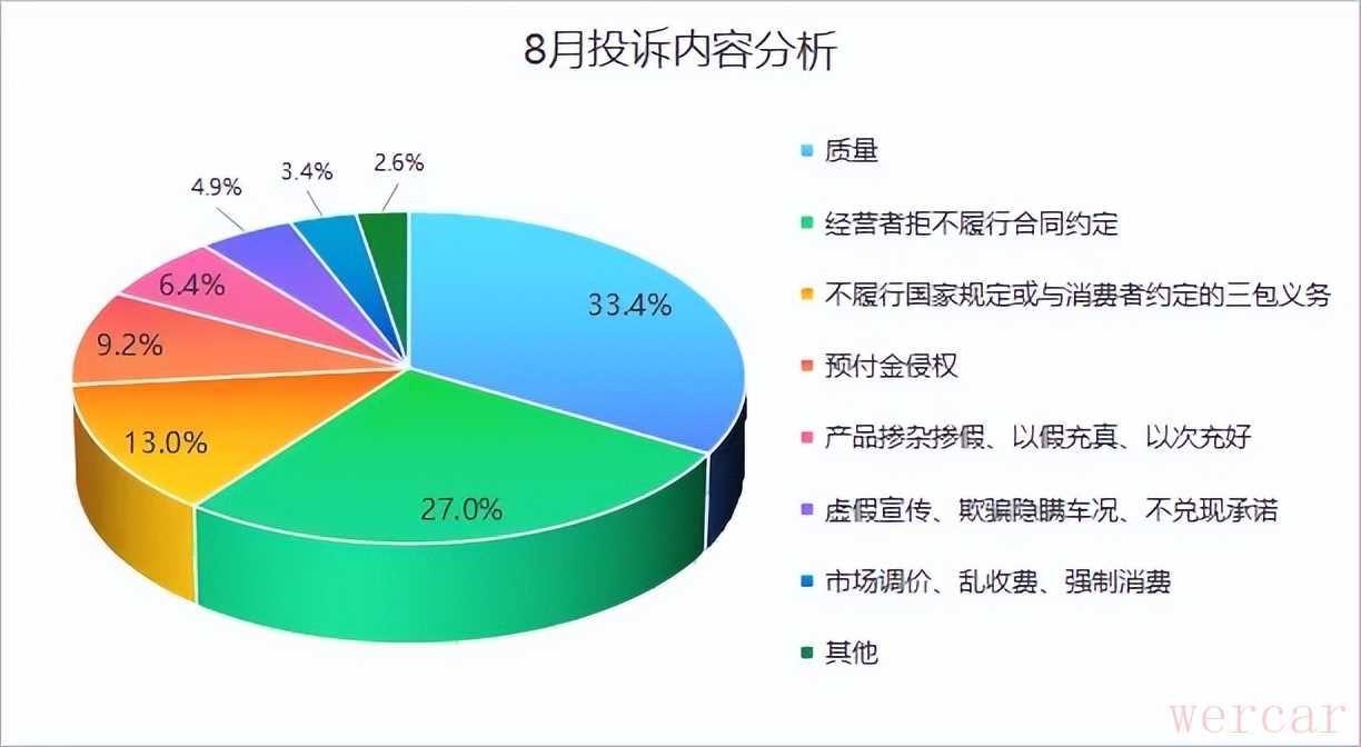 质量问题投诉占比从7月的26.3%升至33.4%,成为最突出问题,主要涉及新能源汽车电池续航虚标、车机系统故障,以及传统燃油车发动机异响、变速箱顿挫等。