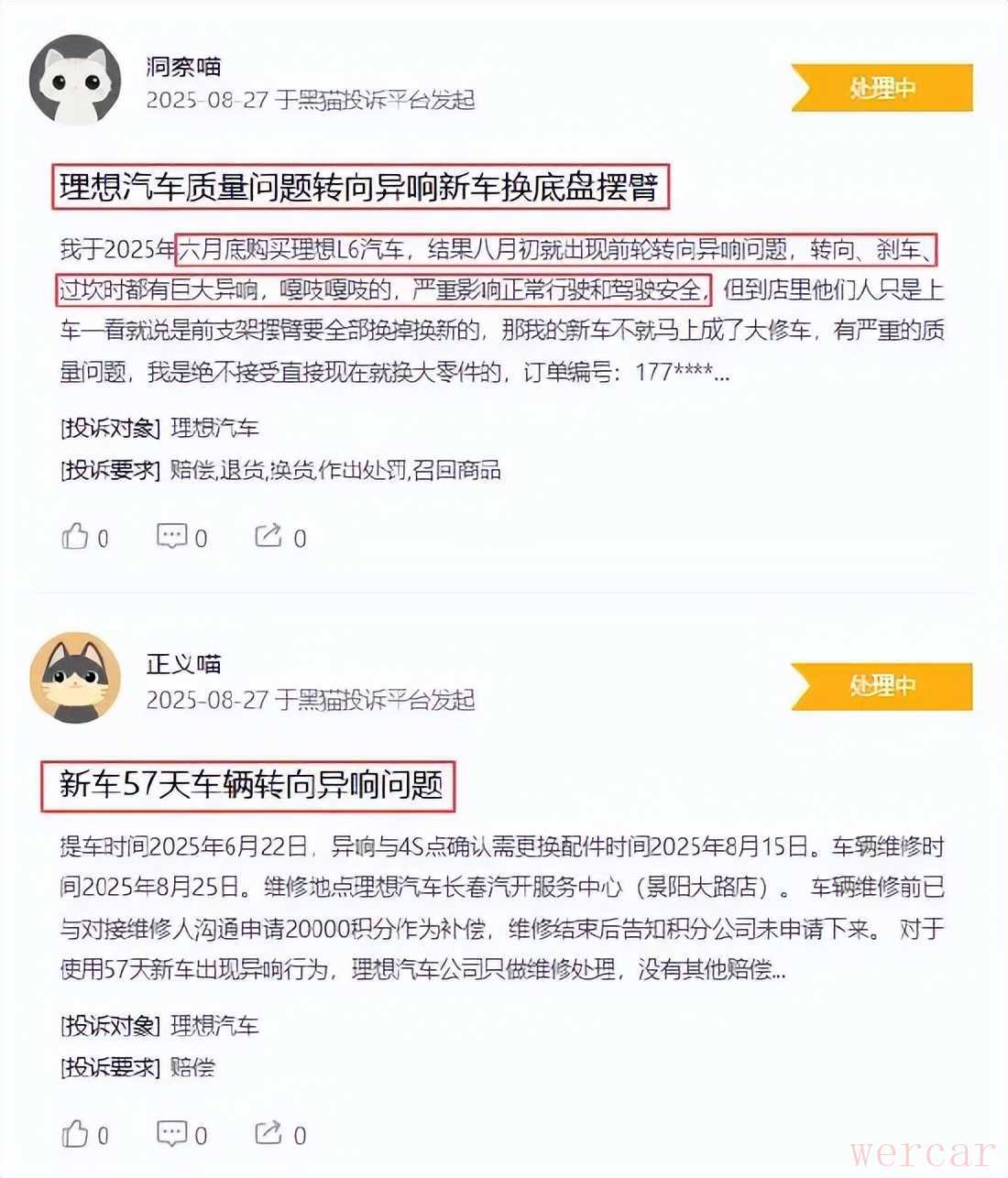 据黑猫投诉平台,8月份,多位理想车主反映,新车购买不到2个月就出现前轮转向异响问题,转向、刹车及过坎时发出巨大异响。理想售后检测后要求更换底盘摆臂等核心部件,但拒绝为新车大修提供合理补偿。有车主提车57天即需维修,事先承诺的2万积分补偿也未兑现。消费者质疑车辆存在质量缺陷,要求理想汽车提供合理的补偿方案,而非单纯维修。目前理想厂家对于新车异响问题仅作维修处理,未给予任何实质性赔付。截至目前,理想汽车累计投诉3882件,回复率仅为3.4%。
